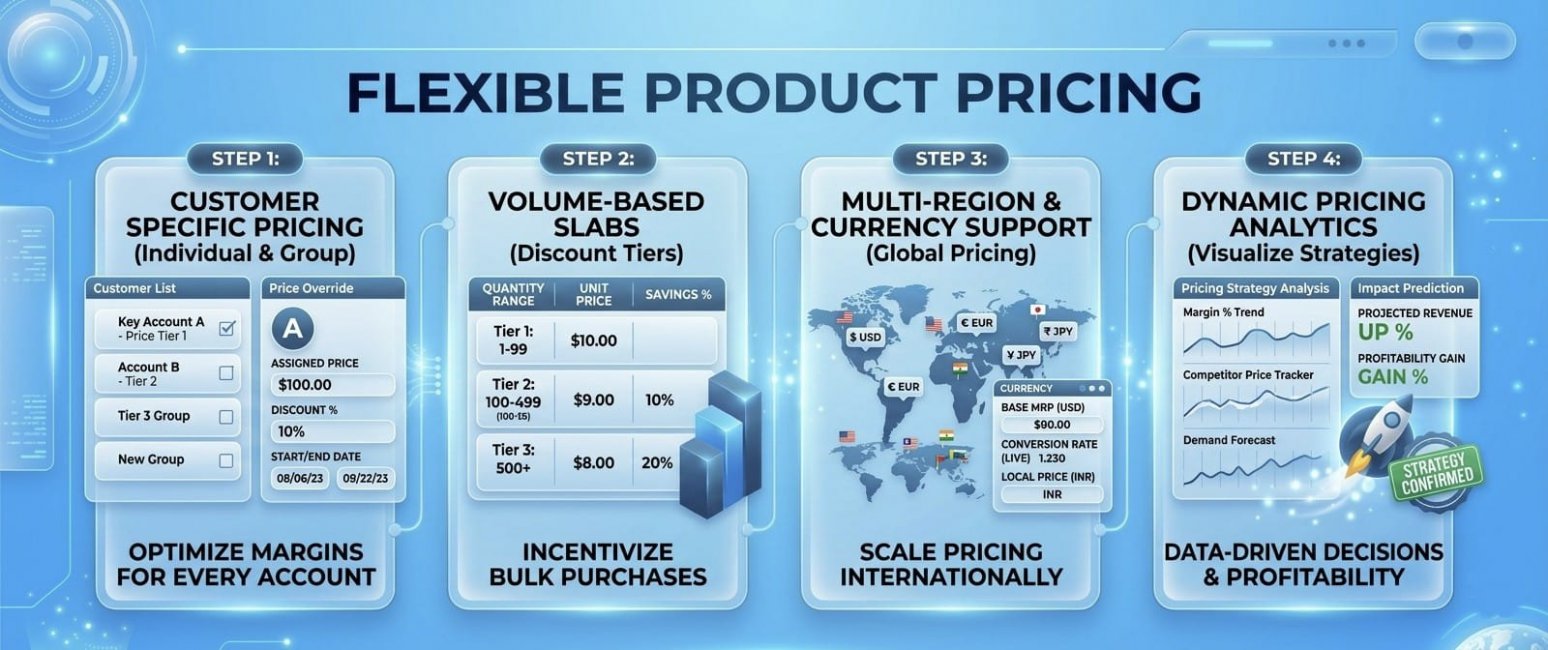 With built-in volume-based pricing, you can incentivize bulk orders and increase order value effortlessly, while a standard MRP keeps your pricing consistent for general buyers. This powerful combination helps you stay competitive, close deals faster, and boost overall revenue.