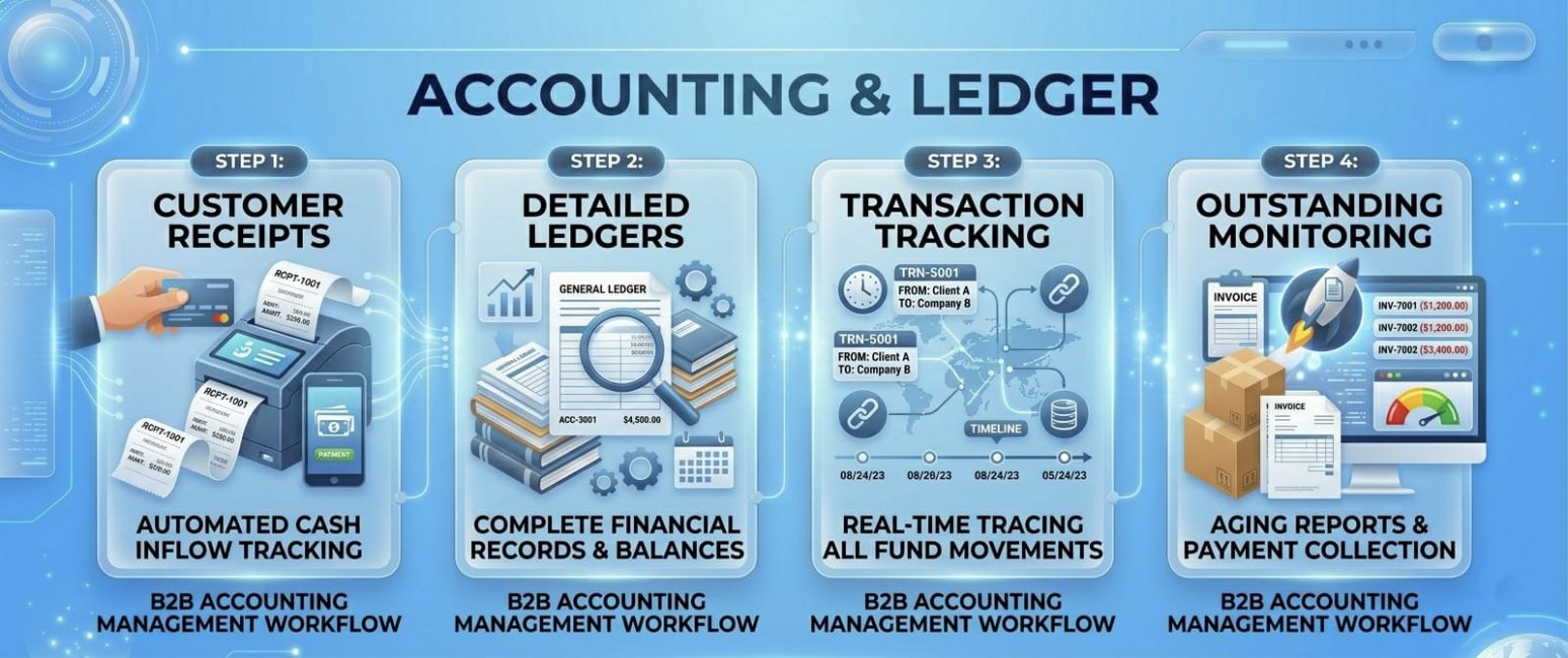 Our Accounting & Ledger system is designed to provide complete control over customer financials in a B2B environment. Businesses can efficiently manage customer receipts, ensuring that every payment is accurately recorded and reconciled.